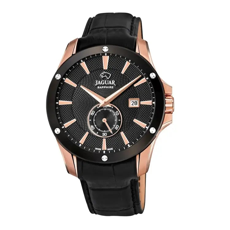 Jaguar Acamar J882/1 er skabt til manden, der vil signalere stil uden at råbe. Den sorte skive, rosaguld‑detaljerne og den sorte læderrem skaber et eksklusivt helhedsudtryk, der passer perfekt til både habit og velklædt hverdagsbrug. Med Swiss Made‑kvalitet og et præcist Ronda‑urværk får du et ur, der leverer pålidelig elegance – dag efter dag.