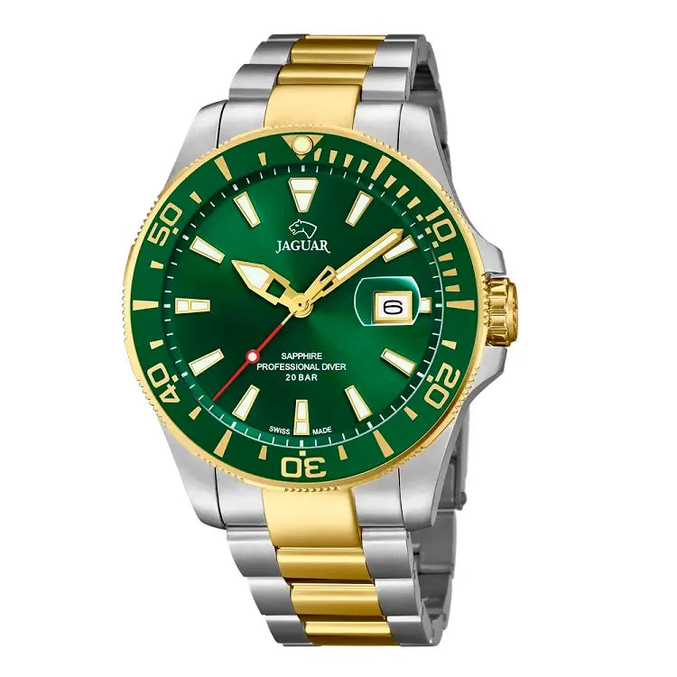 Jaguar Executive Diver J863/B er skabt til mænd, der vil have mere end bare et ur. Med sit markante 43 mm stålhus, safirglas og elegante bicolor-design i grøn og guld signalerer uret selvsikkerhed, kvalitet og eventyrlyst. Den schweiziske quartz-mekanisme sikrer pålidelig præcision – uanset om du er på kontoret eller under overfladen.
