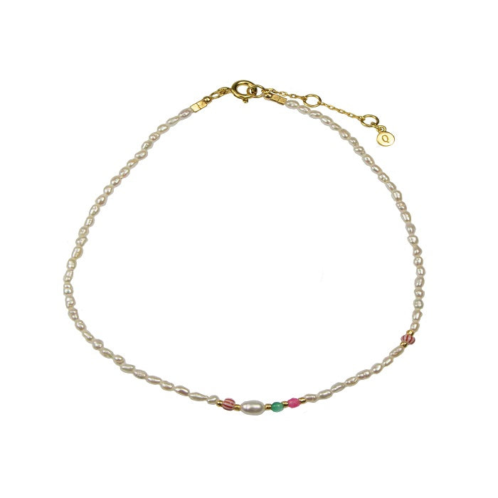 Leonora ankelkæde i 18 kt. forgyldt sterlingsølv med ferskvands perler og farvede glas sten fra Hutlquist Copenhagen.