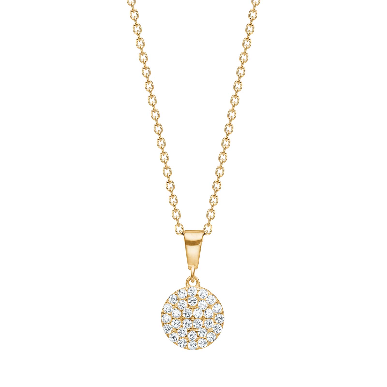 Dette runde vedhæng i 8 karat guld er skabt til dig, der elsker diskret luksus. De funklende hvide kubiske zirkonia giver et elegant spil i lyset, mens det minimalistiske design gør smykket let at bære hver dag. Et sikkert valg, når du vil føle dig velklædt uden at overdrive.