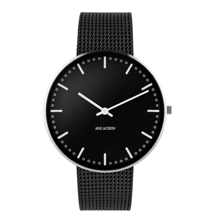 Arne Jacobsen City Hall armbåndsur med mat sort 20 mm meshlænke. Skiven på dette ur er 40 mm.