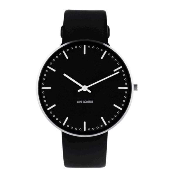 Arne Jacobsen City Hall armbåndsur med sort 20 mm læderrem i kalveskind og børstet stålspænde. Skiven på dette ur er 40 mm.
