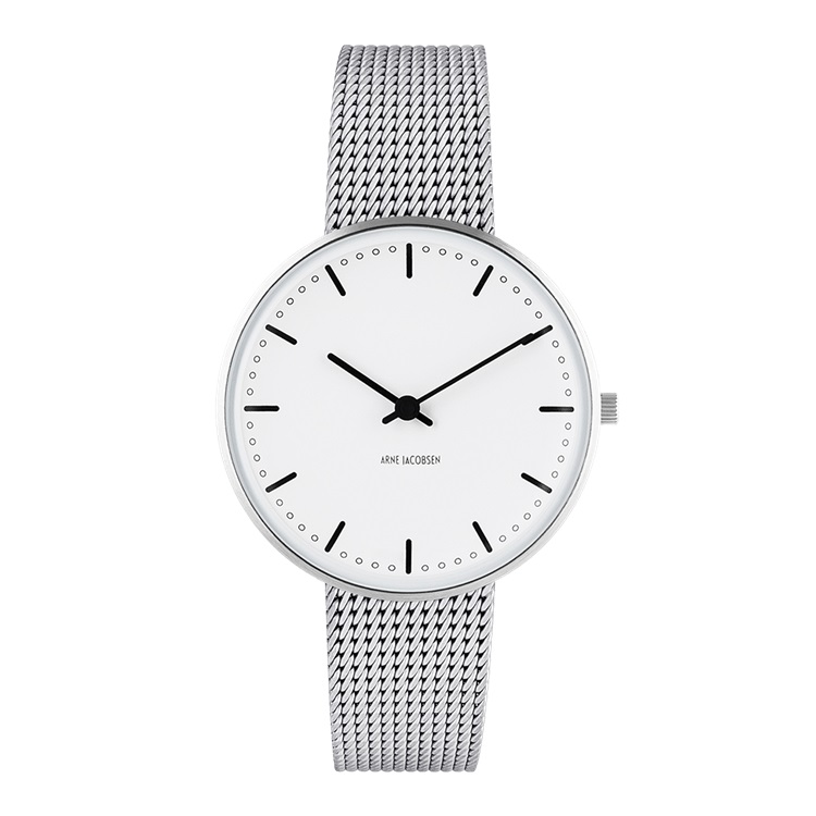 Den hvide urskive tilføjer underspillet elegance, men du vil altid være i stand til at se klokken takket være de tydeligt markerede timemarkeringer, der gør det ubesværet at aflæse dit ur, selv i dårligt lys. For at sikre, at du ser godt ud fra dag ét og i mange år fremover, er dette smukke ur udstyret med en holdbart meshlænke lavet af mat stål for optimal komfort og kvalitetsfornemmelse. Med en vandmodstandsklasse på 3 ATM kan du tage et stænk eller to uden frygt. Indvendigt finder du et pålideligt kvartsurværk, der kører på minimal strøm, så du kan forvente mange års god service med Arne Jacobsen City Hall 53201-1608.