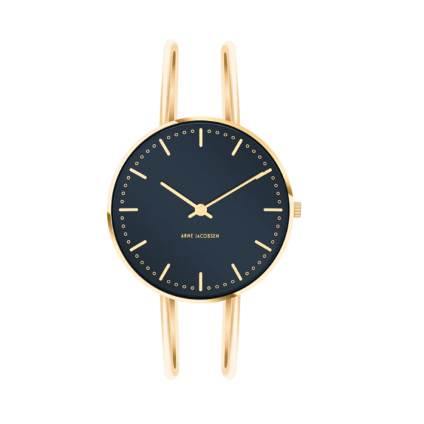 Arne Jacobsen City Hall 53207-1619 er mere end et ur – det er et stykke dansk designhistorie til håndleddet. Med sin dybe Oxford Blue urskive og elegante guldfarvede bøjle forener det funktionalisme og luksus i ét roligt, selvsikkert udtryk. Den 34 mm kasse gør uret let, feminint og smykkelignende uden at miste sin arkitektoniske kant. Designet stammer direkte fra Arne Jacobsens City Hall-ur fra 1956 og bærer stadig den samme kompromisløse enkelhed, som gør det evigt relevant. Dette er uret til dig, der ønsker diskret eksklusivitet og et design, der aldrig råber – men altid bliver bemærket.