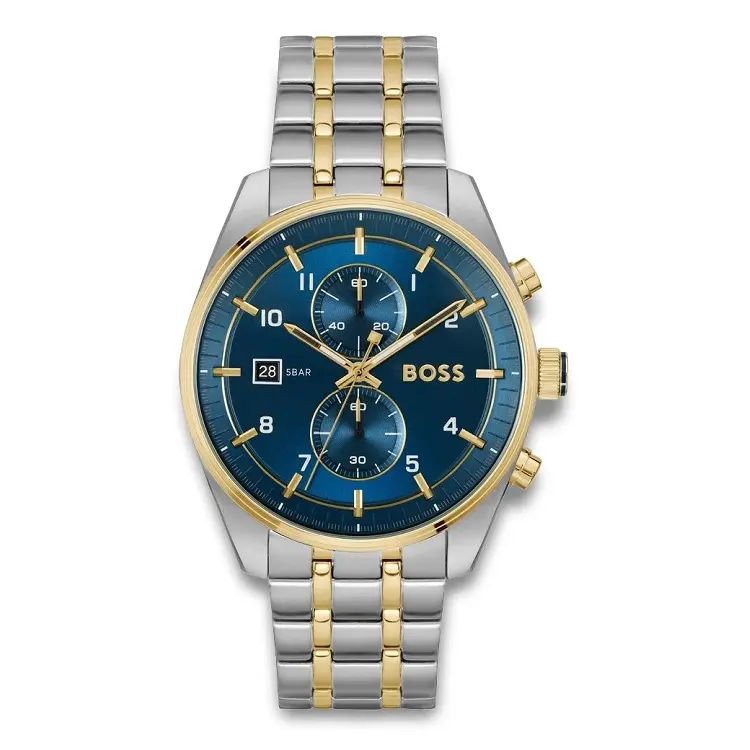 BOSS Skytraveller 1514247 er skabt til manden, der vil kombinere sportslig funktionalitet med eksklusivt design. Det pilot-inspirerede kronografur udstråler selvtillid med sin blå skive, markante stålkasse på 44 mm og elegante bi-colour detaljer i guldtone. Resultatet er et ur, der løfter både hverdagslook og formelt outfit – uden at virke anstrengt.