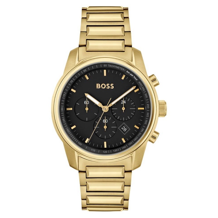 Vi præsenterer BOSS Trace 1514006, et fantastisk ur, der helt sikkert vil imponere dig. Dette ur har en 44 mm urkasse af rustfrit stål med en guldfinish, der giver det et elegant look. Den sorte urskive er præget af en tachymeter, kronograf og datofunktion, mens stållænken fuldender det stilfulde design. BOSS Trace 1514006 er også vandbeskyttet til 5 ATM, hvilket gør det perfekt til enhver aktivitet. Med sin sofistikerede stil og funktionalitet er BOSS Trace 1514006 et must-have for enhver mand, der ønsker at gøre et statement.