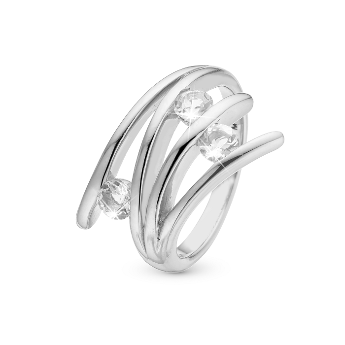 Christina Balance Love ring 4.1.A er skabt til kvinden, der vil udtrykke både styrke og harmoni. Den brede statementring i 925 sterlingsølv kombinerer flere fine sølvbaner, som smelter sammen i et dynamisk og stilrent design. De tre hvide ægte topaser fanger lyset smukt og tilfører et eksklusivt touch, der gør ringen til et naturligt blikfang – både til hverdag og fest.