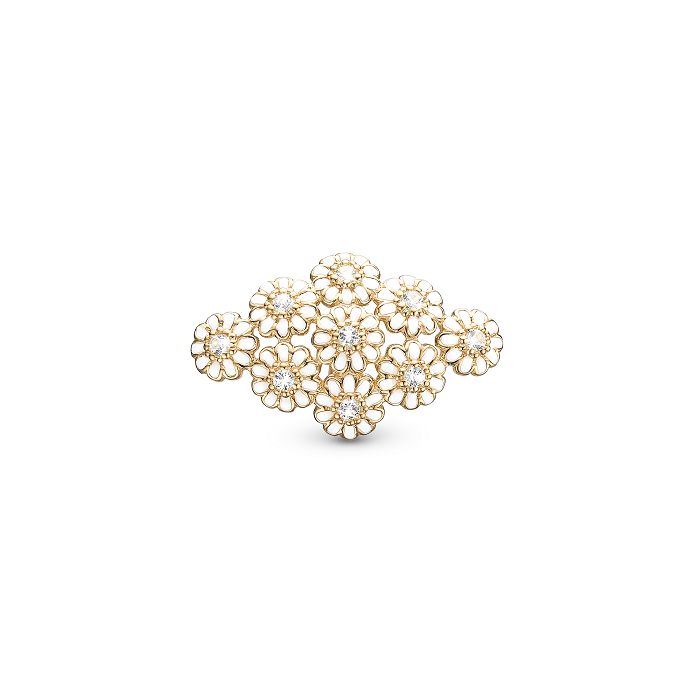 Christina Charm Marguerites Field forgyldt indfanger essensen af klassisk, skandinavisk design i et feminint og eksklusivt udtryk. Ni smukt udførte margueritter danner et harmonisk blomsterfelt, hvor hvid emalje og funklende hvide topaser skaber liv og glans. Et charm, der øjeblikkeligt tiltrækker opmærksomhed og fortæller en historie om sommer, lethed og stil.
