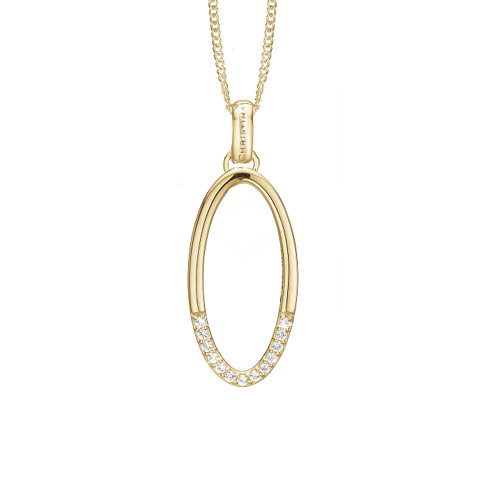Christina Elegance vedhæng 680-G73 er skabt til kvinden, der ønsker et smykke med diskret luksus og maksimal udstråling. Det ovale design i forgyldt sterlingsølv fremhæver halsen med lethed, mens de funklende hvide topaser fanger lyset ved hver bevægelse. Et feminint vedhæng, der løfter både hverdagslook og festtøj.