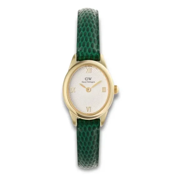 Daniel Wellington Ophelia Mini Gold DW00100892 er skabt til kvinden, der ønsker diskret luksus med maksimal effekt. Den ovale guldbelagte stålkasse og det hvide guilloché-urskive skaber et feminint udtryk, mens den grønne lizard-prægede læderrem tilfører karakter. Slank, let og raffineret – perfekt til små håndled og til dig, der vil skille dig ud med stilfuld selvsikkerhed.