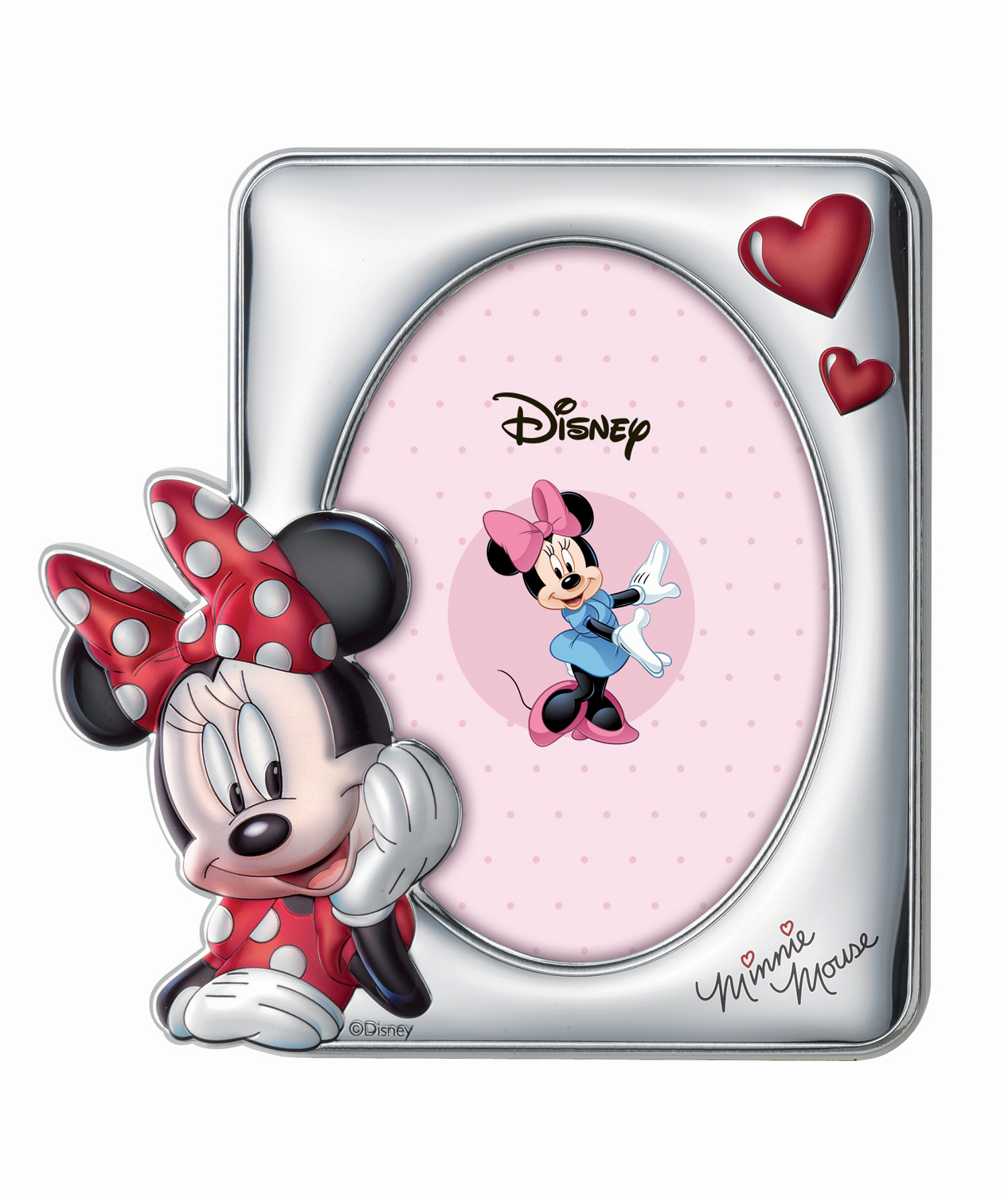 Disney Minnie fotoramme, Minnie i rød kjole med rød sløjfe og 2 hjerter.