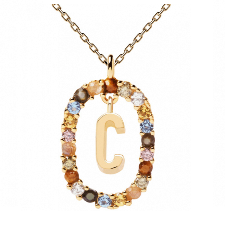 Smuk halskæde i forgyldt sølv med C omkranset af multifarvede zirkoner