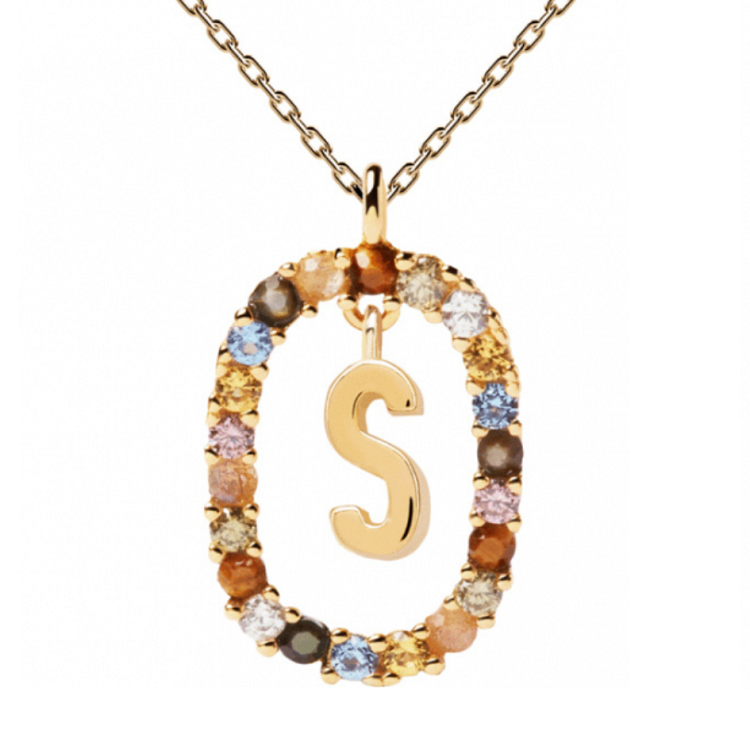 Smuk halskæde i forgyldt sølv med S omkranset af multifarvede zirkoner