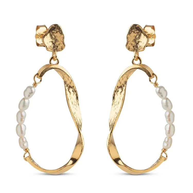 Aloma Pearl øreringe E339GM fra ENAMEL Copenhagen er skabt til dig, der ønsker et eksklusivt udtryk uden at gå på kompromis med komfort. Det håndlavede design i 18 karat forgyldt sølv og ferskvandsperler giver et raffineret look, der smyger sig smukt om øreflippen og føles let hele dagen.