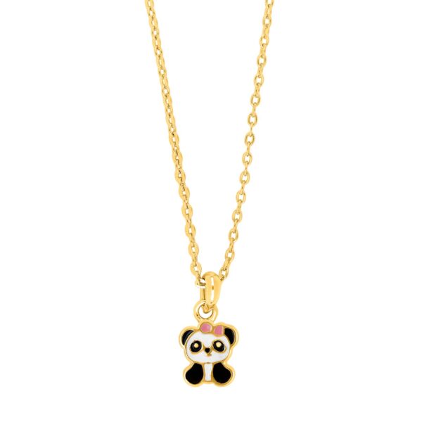 Dette forgyldte sølvvedhæng med panda og emalje er skabt til at bringe glæde hver eneste dag. Det søde pandamotiv i sort og hvid emalje, toppet med en lyserød detalje, taler direkte til børns fantasi. Overfladen er blank og beskyttende, så smykket holder sig smukt – også når det bruges flittigt. Med en let og behagelig størrelse er det ideelt til børns følsomme hud og aktive hverdag.