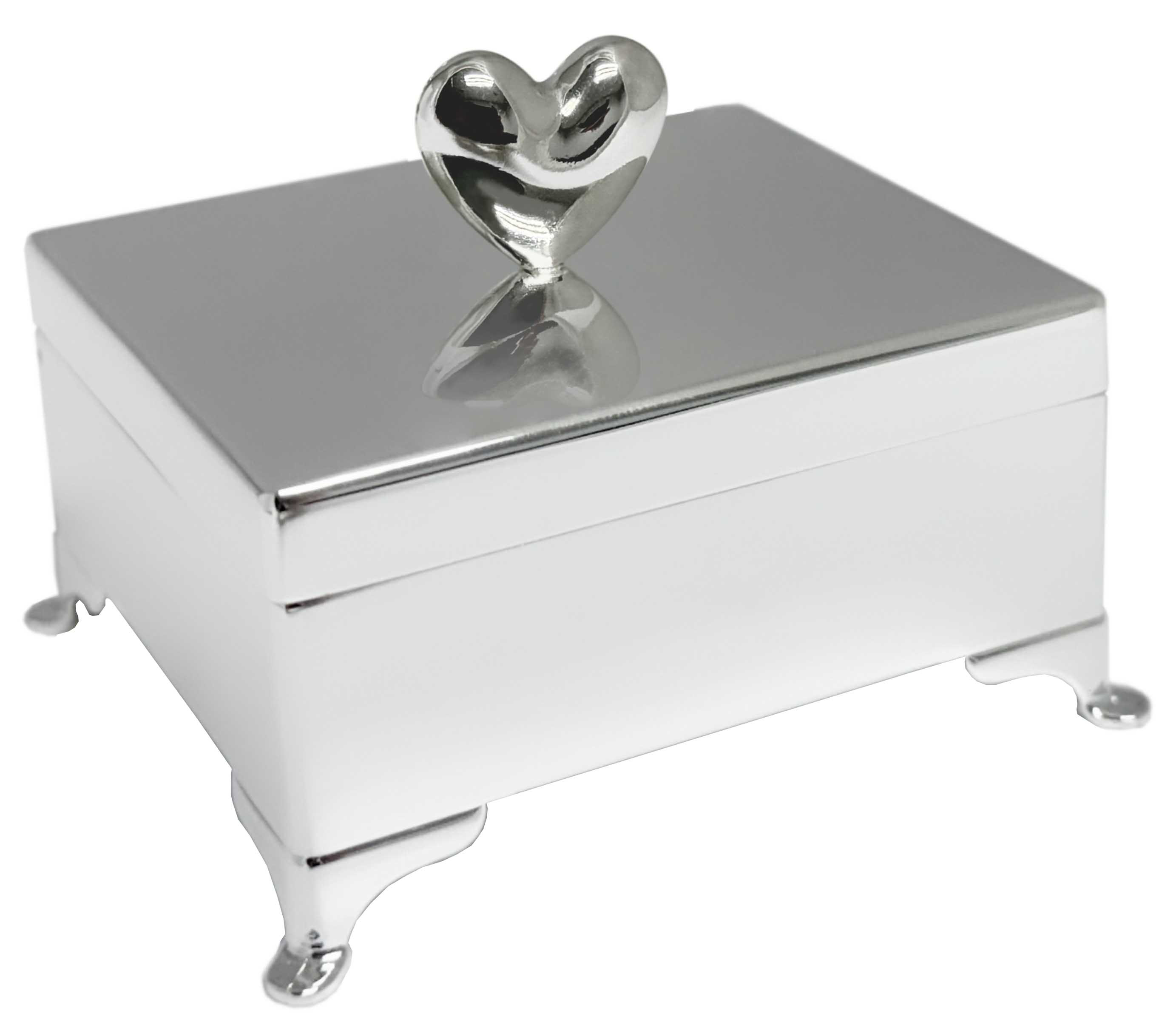 Det forkromede smykkeskrin med hjerte er en tidløs og følelsesladet gave, skabt til at bevare barnets første minder. Den blanke, forkromede overflade stråler af kvalitet og beskytter skrinet i mange år. Den elegante hjerteform og fine detaljer gør det ideelt som dåbs- eller fødselsdagsgave, der både rører hjertet og pynter perfekt på børneværelset.