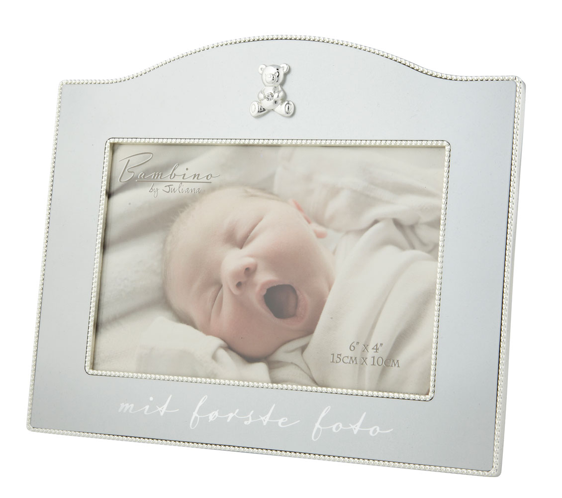 Bedårende fotoramme i forsølvet med flotte detaljer. Rammen er dekoreret med en sød bamse i toppen, og med teksten mit første foto i bunden. Rammen kan gives som en personlig og minderig dåbs- eller barselsgave. En super fin måde, at bevare mindet om b