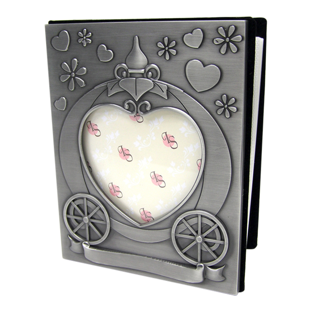 Eventyrligt og unikt fortinnet fotoalbum. På forsiden af fotoalbummet ses en græskarkaret, der danner ramme om forsidebilledet. Derudover er albummet dekoreret med fine motiver af hjerter og blomster. Fotoalbummet giver et eventyrligt udtryk, der sætte
