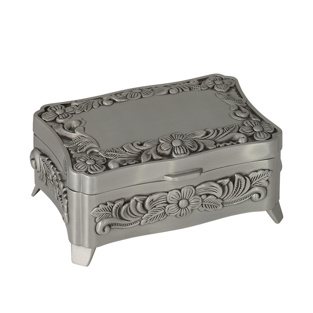 Dette fortinnede smykkeskrin med blomster forener klassisk design med varig kvalitet. De fine blomsterdetaljer og den elegante højde på små fødder giver et eksklusivt udtryk, der pynter på ethvert bord. Perfekt til ringe, øreringe og minder, der fortjener en smuk og sikker plads.