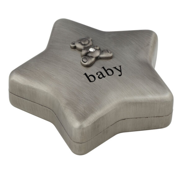 Fortinnet sparebøsse stjerne m. bamse Bambino er en hjertevarm dåbsgave, der kombinerer sødt design med varig værdi. Den charmerende stjerneform og bamsen med hjerte skaber følelser, mens muligheden for personlig gravering gør gaven helt unik. En gave, der bliver gemt – og husket – i mange år.