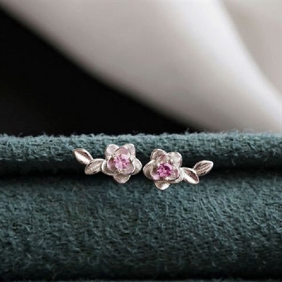 Disse øreringe er fine og "blomstrede" i deres mønster og har i midten en enkelt smuk lysserød sten. Øreringene sidder på en stik, med en almindelig lås bagpå.