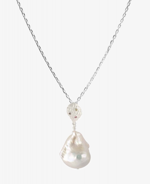 Hultquist Eldoris halskæde i sølv forener naturlig skønhed med moderne finesse. Den store hvide barok ferskvandsperle gør hvert smykke unikt, mens de multifarvede cubic zirkonia tilfører diskret glans. I 925 sterlingsølv får du et feminint blikfang, der føles let, eksklusivt og skabt til at blive båret igen og igen.