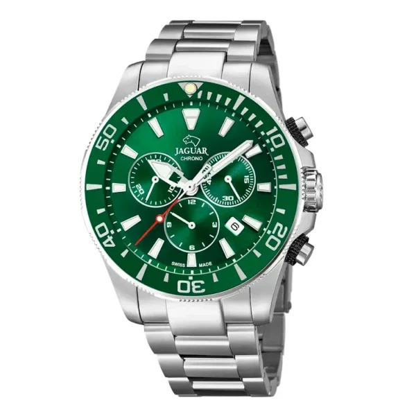 Jaguar Executive Diver J861/4 er skabt til mænd, der kræver mere af deres ur – både over og under vandet. Med sin 43,5 mm rustfri stålkasse i 316L og en vandtæthed på 200 meter leverer dette Swiss Made dykkerur kompromisløs pålidelighed. Det sorte lakerede urskive-design bag safirglas udstråler klassisk elegance, mens de luminøse visere og indeks sikrer perfekt aflæsning i alle lysforhold. Quartz-værket giver præcision i hverdagen og ro i sindet, uanset om du bruger uret professionelt eller som et stilrent statement.