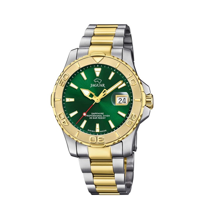 Jaguar Executive Diver J970/1 er et stilfuldt og præcist ur, der er lavet af det kendte mærke Jaguar. Det har en rustfrit stål urkasse på 40 mm i diameter, som er udstyret med en stål lænke. Inde i kassen finder du et Ronda-urværk, som sikrer dig præcision og nøjagtighed. Uret har et safirglas, der giver det ekstra beskyttelse mod ridser og skader. Det er vandtæt op til 20 bar og uret kommer med en 2-årig garanti. Uret har et elegant design med grønne detaljer, som giver det et moderne look.