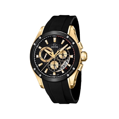 Jaguar Special Edition J691/2 er et luksuriøst og funktionelt herreur, der er designet med en guldbelagt stålkasse og sort gummirem. Uret har et safirglas, sort urskive, quartz urværk og kronograf. Dette elegante ur har en vandtæthed på 10 ATM, så du kan bære det i al slags vejr. Denne Jaguar-specialudgave har et eksklusivt look og er perfekt til at fuldende enhver stil.