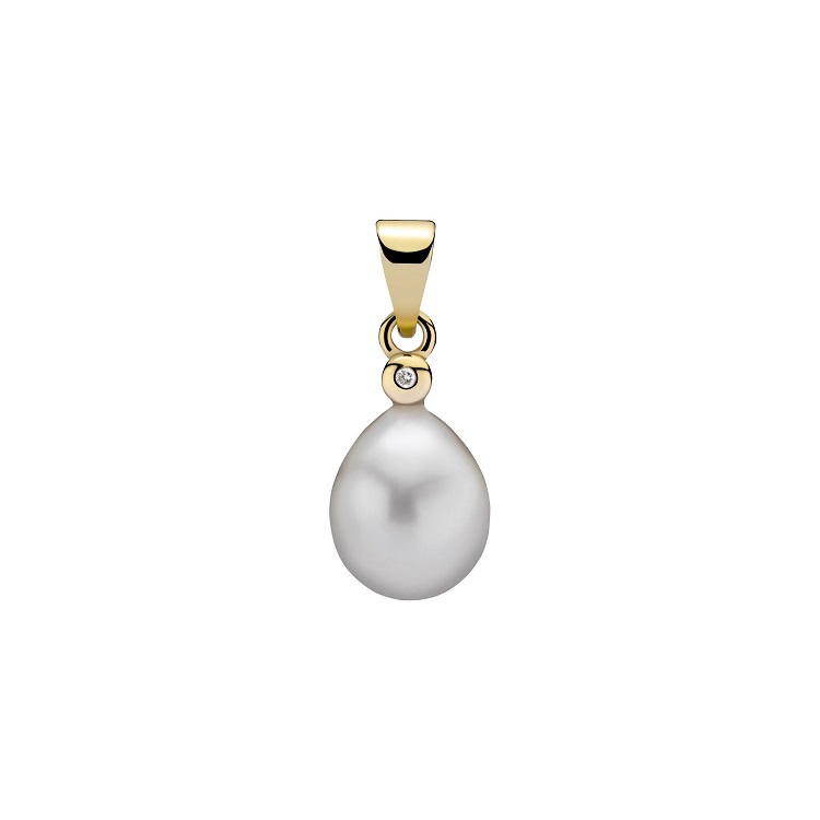 Smukt vedhæng i 8 karat guld med hvid ferskvandsperle 7,5-8 mm og ægte diamant 0,005CT. W.SI.