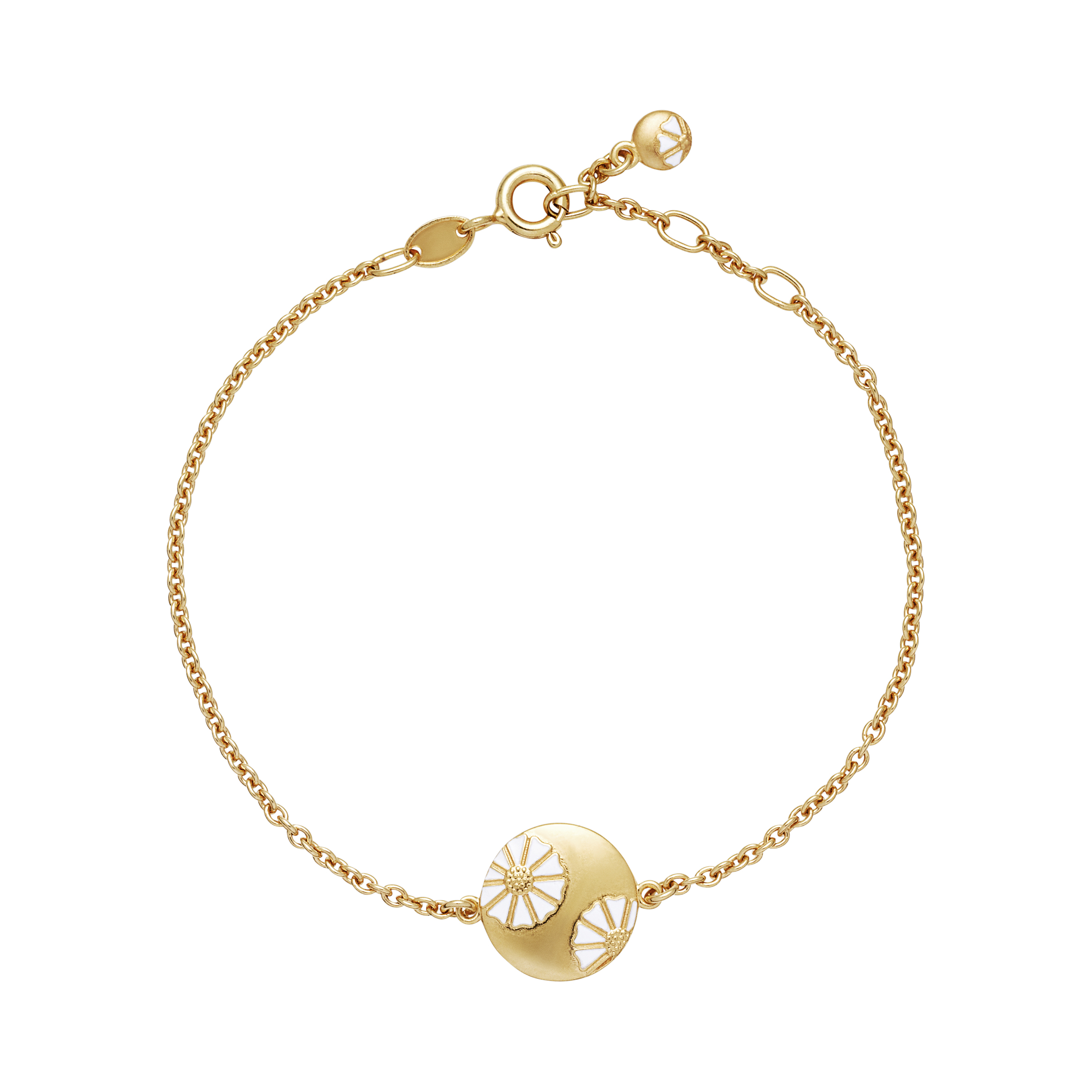 Dette smukke Marguerit armbånd fra Lund Copenhagen forener klassisk dansk design med feminin lethed. Det forgyldte sterlingsølv og den ikoniske marguerit i hvid emalje skaber et elegant smykke, der passer perfekt til både hverdag og fest. Møntvedhænget på 13 mm giver et raffineret blikfang, uden at virke dominerende.