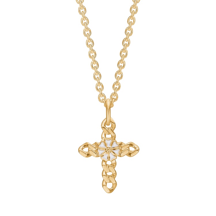 Den smukt udførte marguerit og kors er perfekt kombineret med panserstilen, hvilket skaber en unik og stilfuld halskæde, der vil fange alles opmærksomhed.
