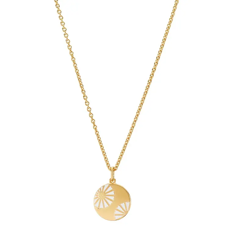 Oplev klassisk skønhed med Lund Copenhagen Marguerit vedhæng med mønt i forgyldt sølv. Det runde 16 mm vedhæng kombinerer hvid emalje og 24 kt forgyldt 925 sterling sølv i et ikonisk margueritmotiv. Et smykke, der udstråler ro, femininitet og skandinavisk designarv – perfekt til både hverdag og særlige øjeblikke.