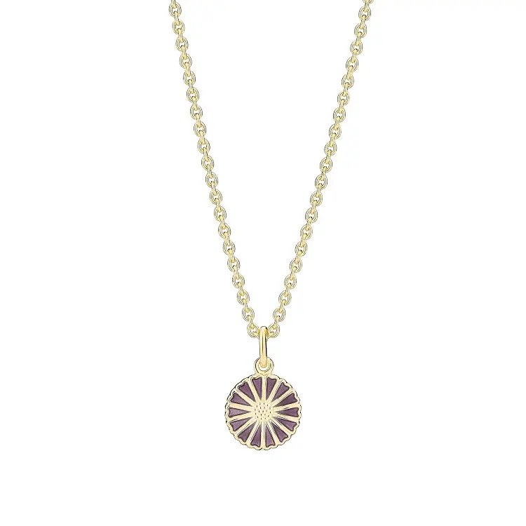 Smuk halskæde i sølv belagt med 24 karat guld og 11 mm. marguerit med lilla emalje