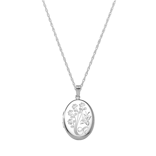 Sød oval medaljon i rhodineret sølv. Medaljonens forsiden er prydet med et ciseleret blomster- og sommerfuglemotiv, mens bagsiden er blank. Der er plads til to billeder inden i medaljonen. Vedhænget måler 24 mm i højden og 19 mm i bredden og