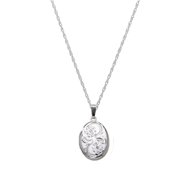 Denne medaljon i rhodineret sølv er mere end et smykke – det er et minde, du bærer tæt på hjertet. Det ovale design med fint ciseleret blomstermotiv udstråler romantik og tidløs elegance. Den blanke bagside giver mulighed for personlig gravering, som forvandler medaljonen til en unik og meningsfuld gave, der vækker følelser hver dag.