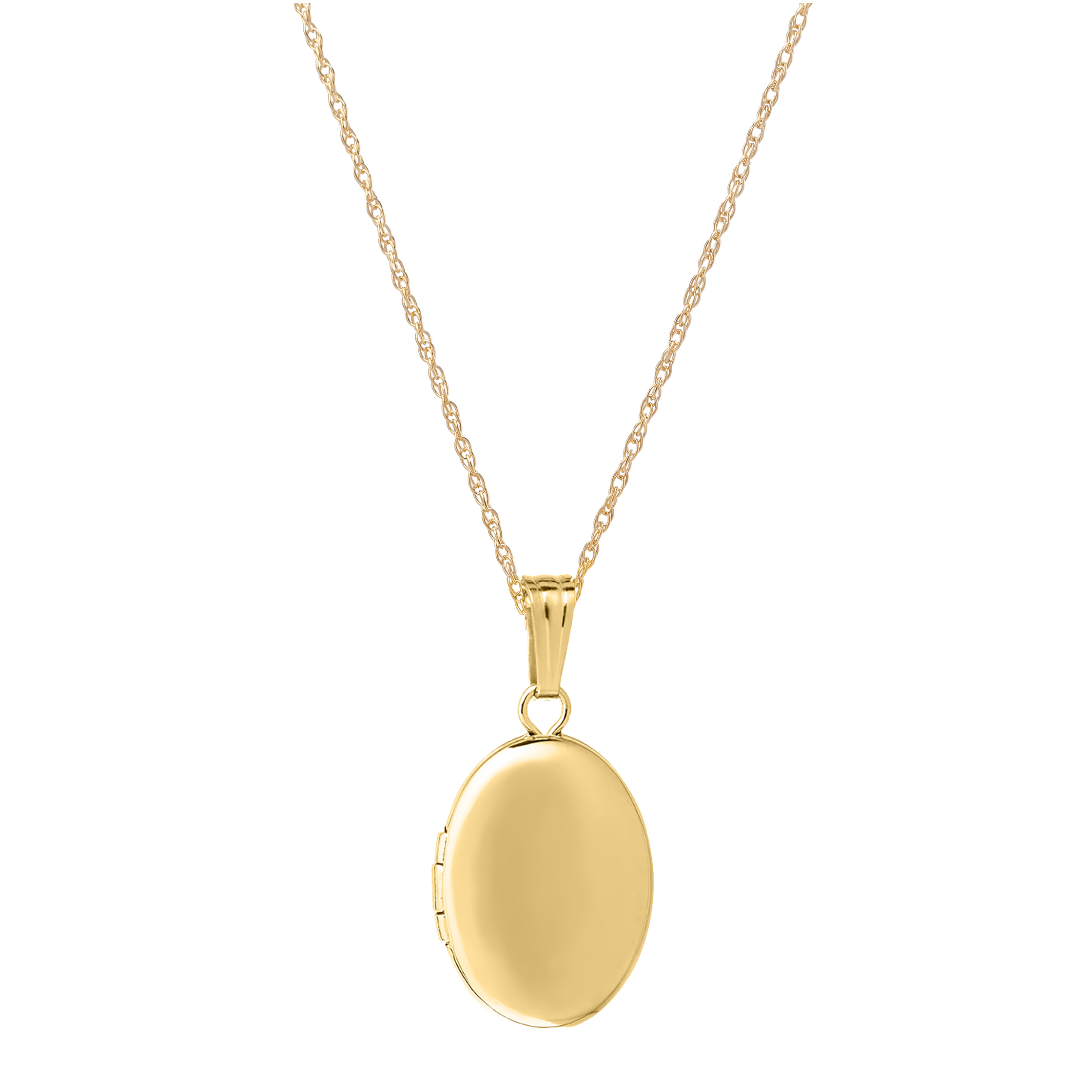 Klassisk og enkel oval medaljon med påvalset 14 karat guld. Medaljonen er blank på både forsiden og bagsiden. Medaljonen er ikke ment til billeder, men der kan lægges noget ind i hulrummet. Vedhænget måler 12 mm i højden og 10 mm i bredden, og de
