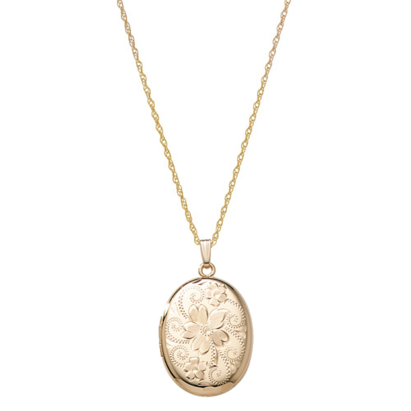 Sød oval medaljon med påvalset 14 karat guld. Medaljonens forside er prydet med et ciseleret blomstermotiv, mens bagsiden er blank. Der er plads til to billeder inden i medaljonen. Vedhænget måler 30 mm i højden og 23 mm i bred