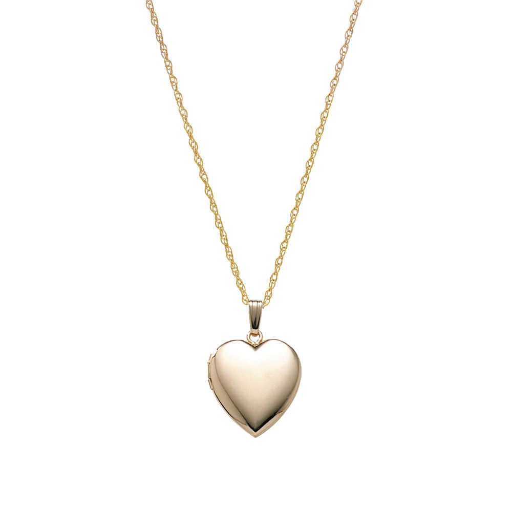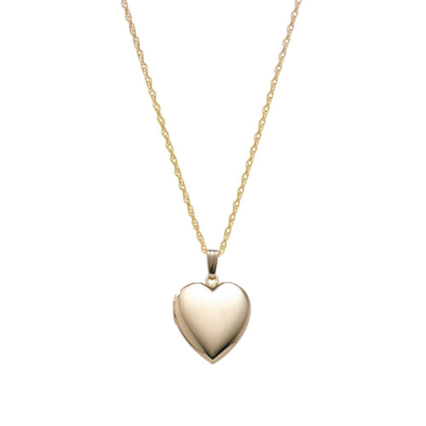 Klassisk og flot hjertemedaljon med påvalset 14 karat guld. Medaljonen er blank på både forsiden og bagsiden. Der er plads til to billeder inden i. Vedhænget måler 19 mm i højden og 18 mm i bredden, og der medfølger en 45 cm lang kæde, hvor d