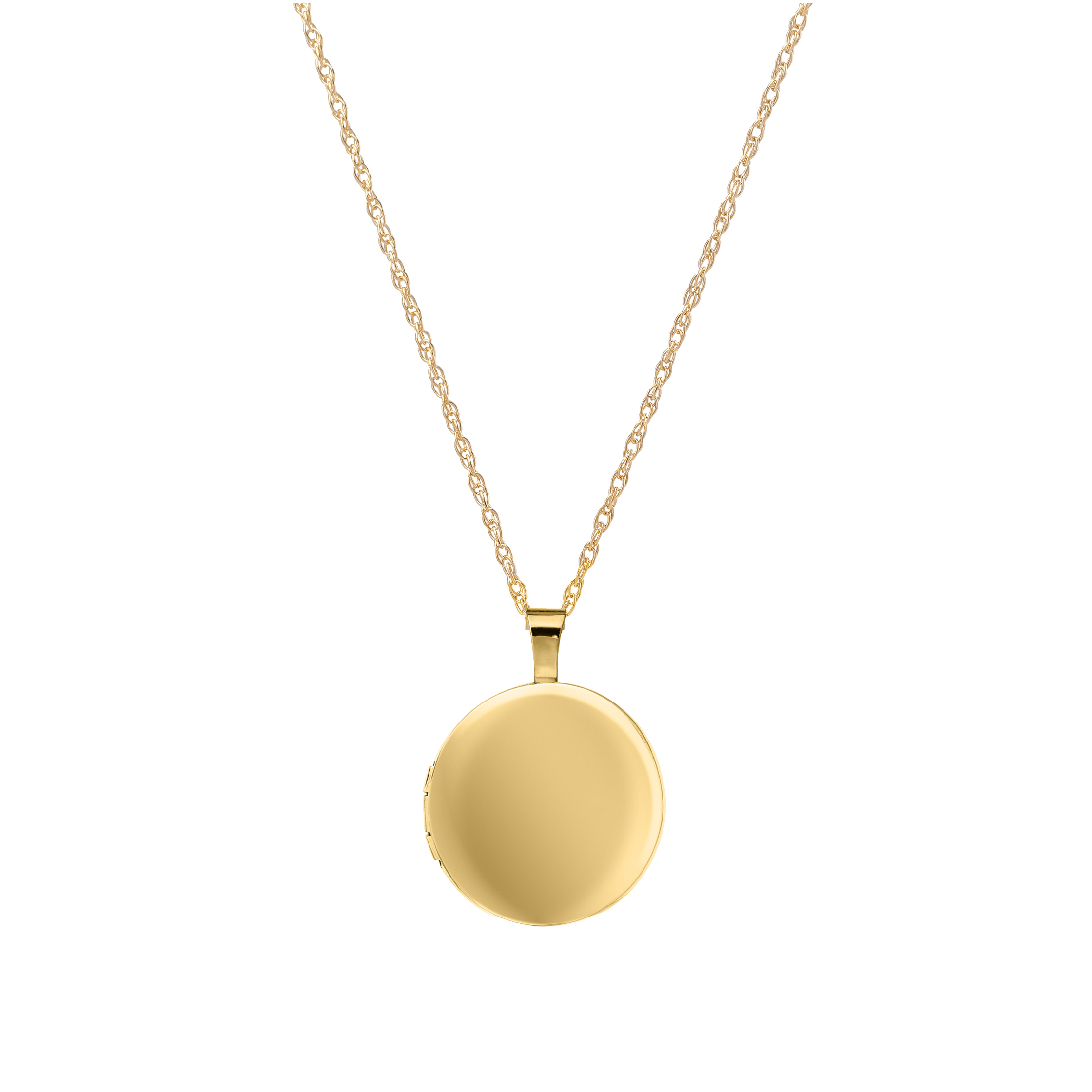 Flot og luksuriøs rund medaljon i 14 karat påvalset guld. Medaljonen har en helt blank overflade med plads til to billeder inden i. Vedhænget måler 18 mm i højden og 18 mm i bredden, og der medfølger en 45 cm lang kæde, hvor der li