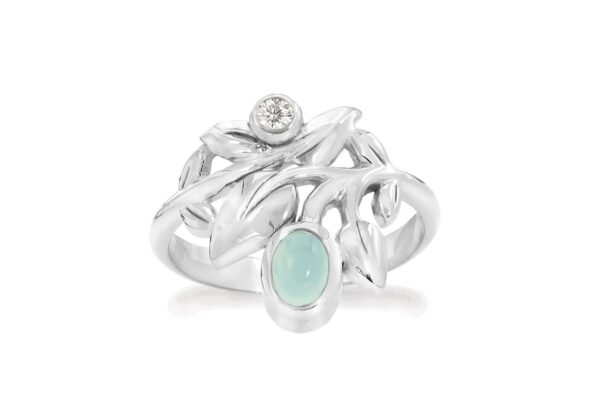 Rabinovich Vitality ring 79616353 er skabt til kvinden, der ønsker et smykke med både ro og karakter. Det romantiske bladmønster slynger sig let omkring fronten og indrammer stenene med et organisk, kunstnerisk udtryk. Den ovale lyseblå calcedon udstråler balance og lethed, mens den lille klare zirkonia giver netop den glans, der fanger blikket – uden at dominere.