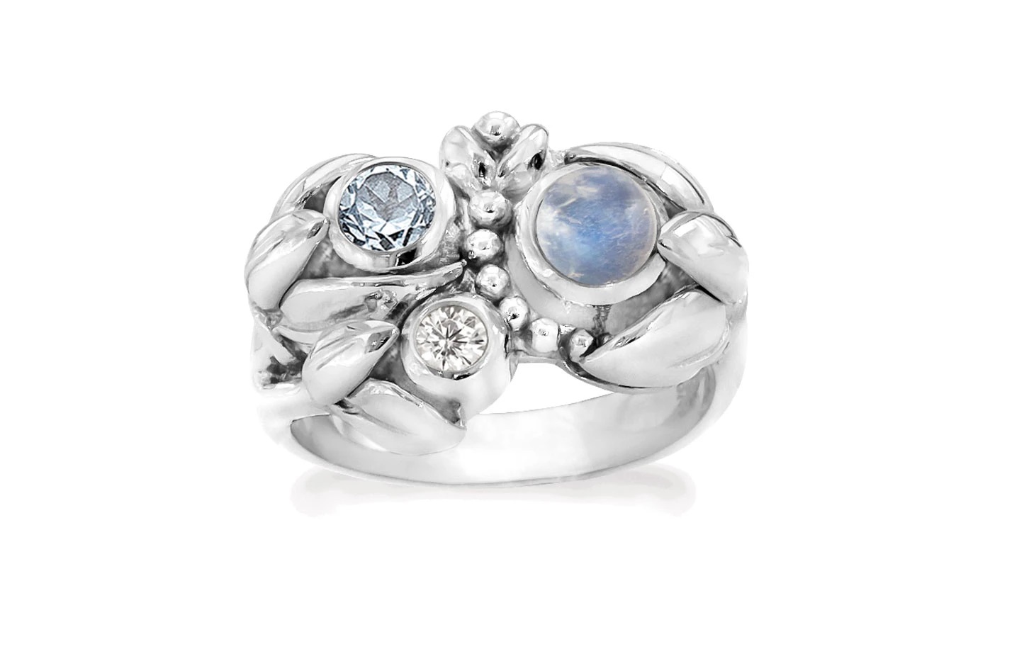 Water Lily-ringen er en del af Rabinovichs populære serie inspireret af åkander og organiske former. Kombinationen af rainbow månesten, blå topas og zirkonia giver et eksklusivt farvespil, der føles personligt og tidløst. Et smykke, der skiller sig ud uden at overdøve din stil.