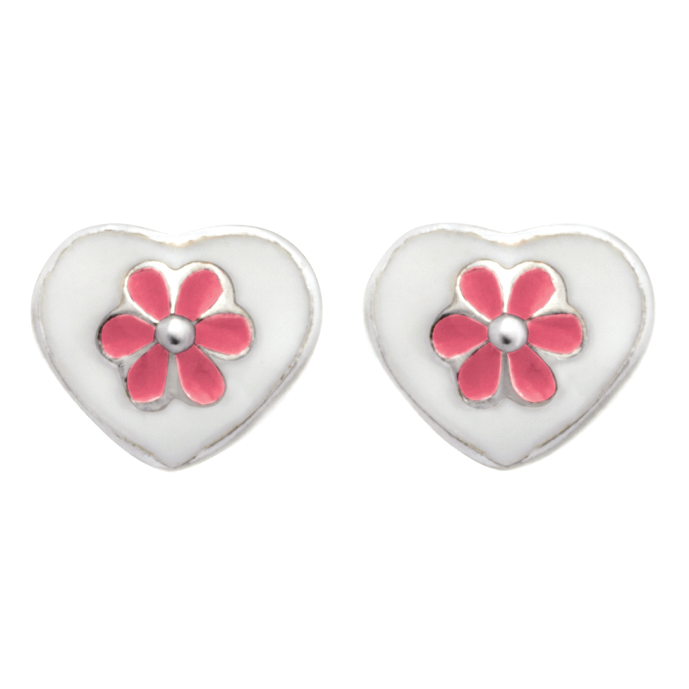 Rhod. sølvørestikker hjerte m/lyserød blomst