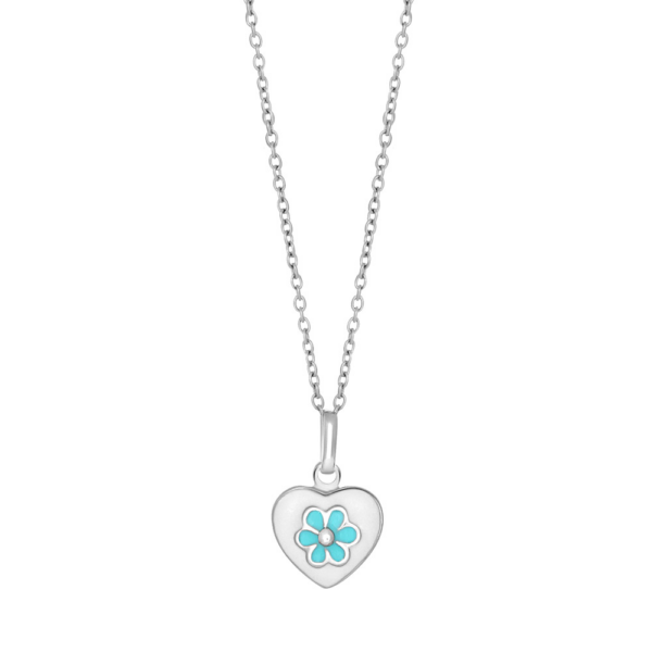 Dette rhodinerede sølvvedhæng med hjerte, blomst og emalje er skabt til at vække glæde fra første øjekast. Det blanke sølv bevarer sin glans, mens de bløde farver og det fine design gør smykket perfekt til børn. Et symbol på kærlighed, tryghed og personlig stil – ideelt som gave til en særlig anledning.