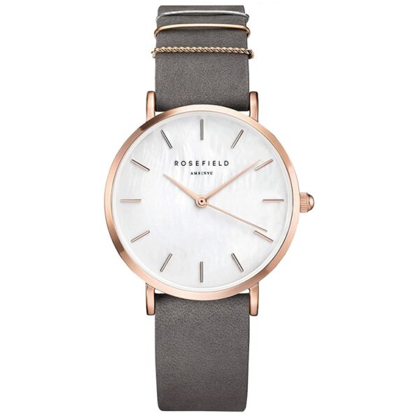 Rosefield The West Village WEGR-W75 er skabt til kvinder, der elsker diskret luksus med personlighed. Den slanke 33 mm rosaguld-tonede bo og perlemorsskive fanger lyset blidt, mens den grå nubuck-rem med metalringe giver et urbant, vintage-inspireret twist. Et ur, der løfter dit outfit uden at råbe højt.