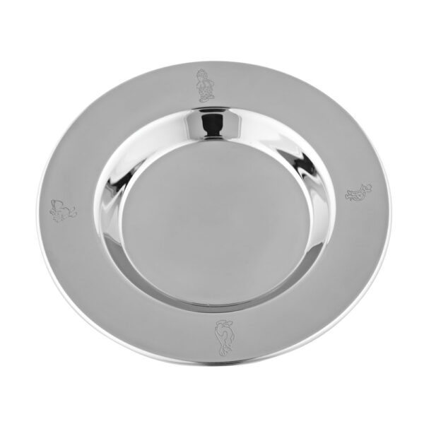 Sød børnetallerken i rustfrit stål, med de fineste indgraverede motiver af den altid eventyrlysten og pandekageglade Rasmus Klump og vennerne fra den kendte danske tegneserie, der fortæller om de eventyr, Rasmus Klump og hans venner oplever. Rasmus Klu