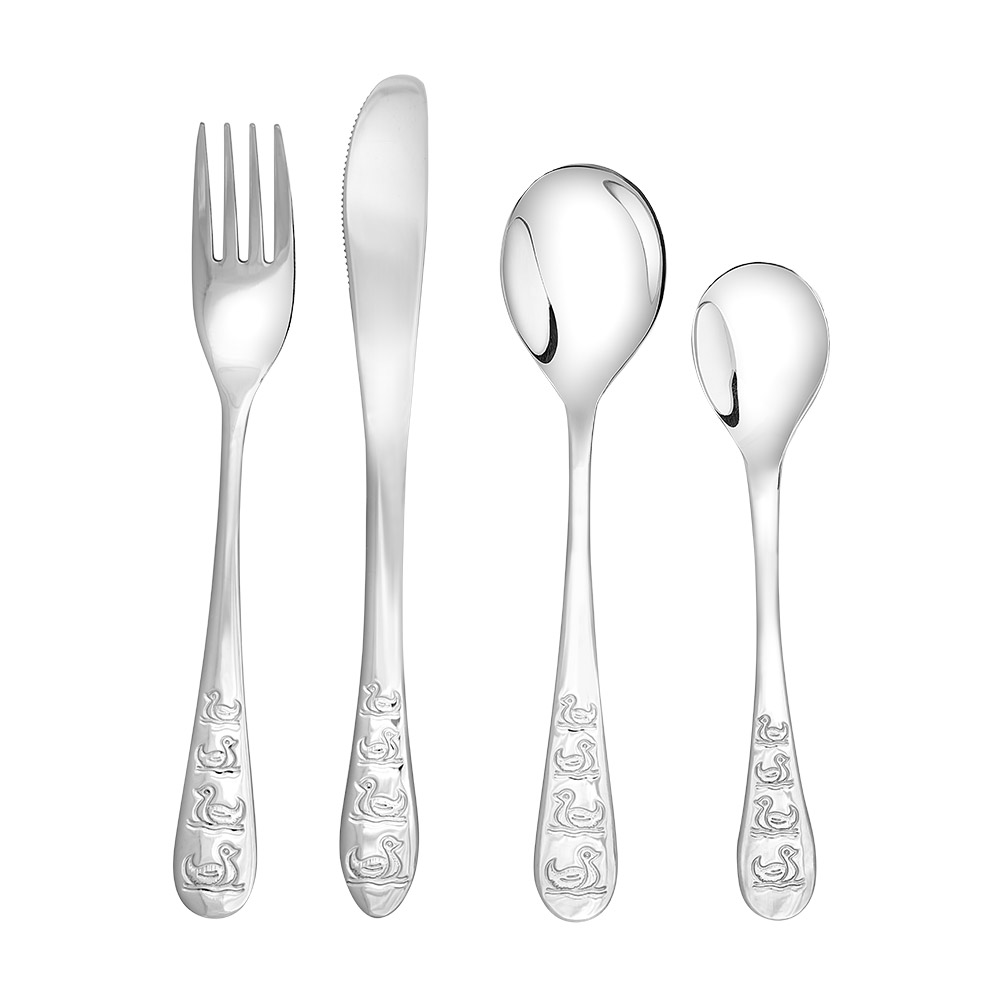 Fint og simpelt børnebestik med små ænder i rustfrit stål. Sættet består af fire dele – en kniv, en gaffel, en spiseske og en teske. Bestik er en populær barnedåbsgave, barselsgave og fødselsdagsgave. Barnet vil uden tvivl elske at have sit eget person
