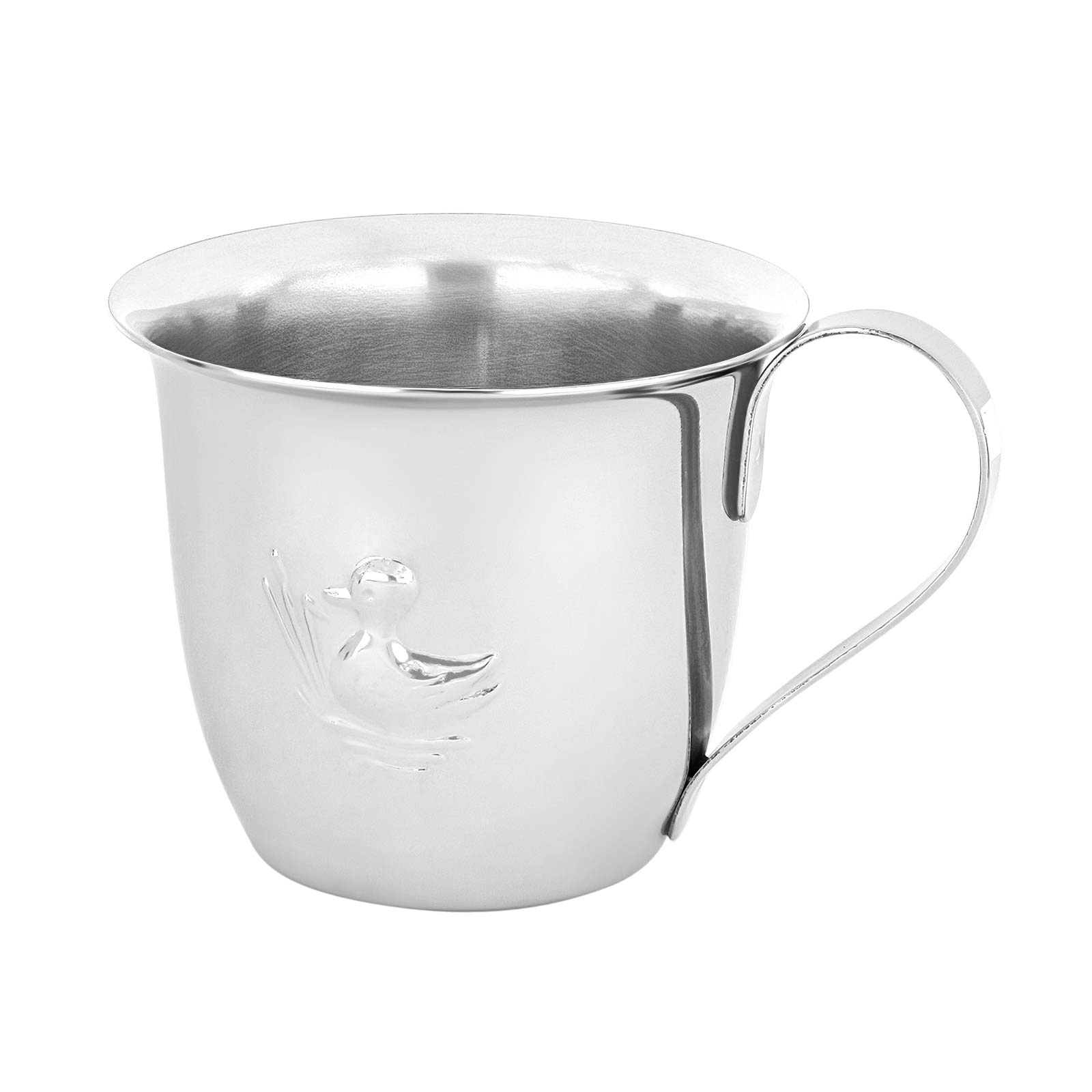 Klassisk rustfrit stålkrus med motiv af en fin lille and på siden. En utrolig fin, dekorativ og brugbar genstand, barnet kan bruge i mange år frem. Kruset vil uden tvivl blive brugt flittigt og barnet vil synes det er sjov med sit helt eget krus ved sp