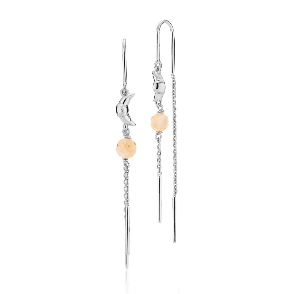 Disse smukke lange øreringe fra Sistie er designet med en kæde og en lille croissant og en lyserød peach moonstone.