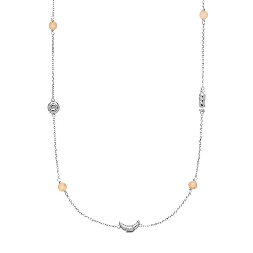 Sød halskæde fra Frederikke Wærens er designet med små lyserøde perler af peach moonstone, en lille karamel, croissant og en kanelsnegl.